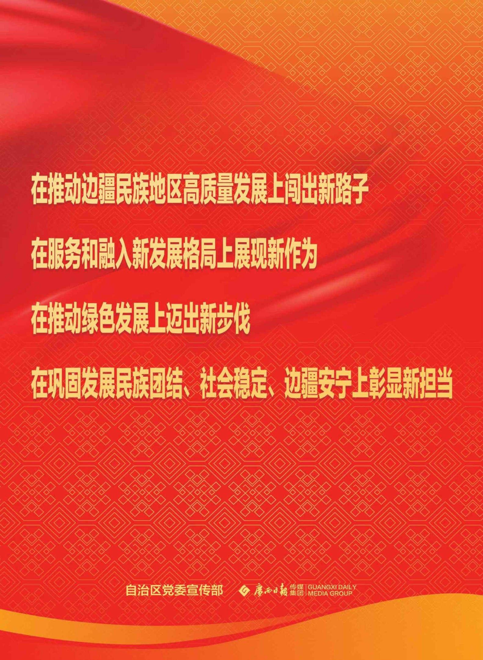 在推動(dòng)邊疆民族地區(qū)高質(zhì)量發(fā)展上闖出新路子,在服務(wù)和融入新發(fā)展格局上展現(xiàn)新作為,在推動(dòng)綠色發(fā)展上邁出新步伐,在鞏固發(fā)展民族團(tuán)結(jié)、社會(huì)穩(wěn)定、邊疆安寧上彰顯新?lián)?dāng)