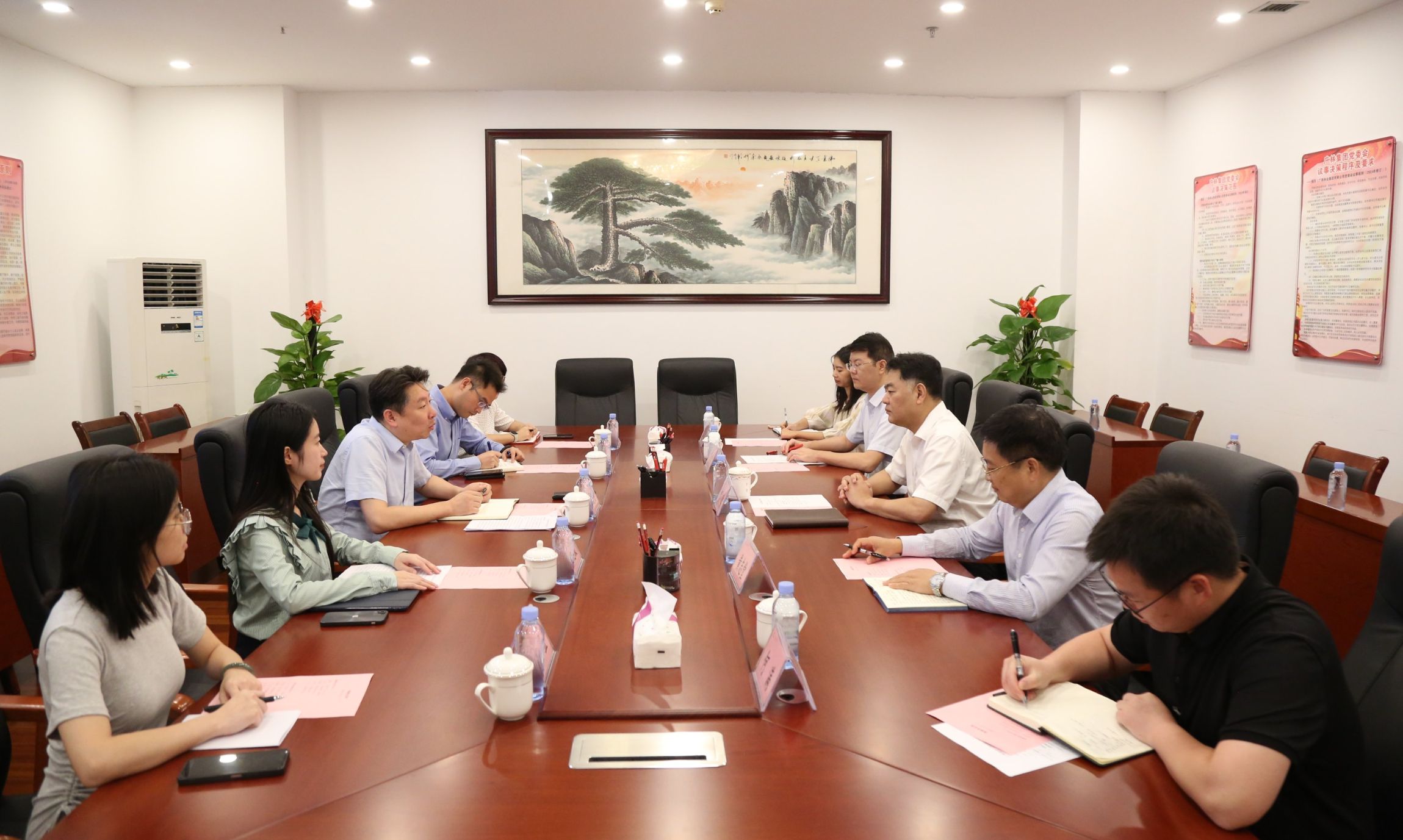 羅勇對(duì)張駿杰一行的到來(lái)表示熱烈歡迎,對(duì)渤海銀行一直以來(lái)對(duì)廣林集團(tuán)提供的金融支持和服務(wù)表示感謝,并詳細(xì)介紹了近年來(lái)廣林集團(tuán)在資源整合及“6+N”業(yè)務(wù)板塊布局發(fā)展情況,在林業(yè)資源、木材加工、林產(chǎn)供應(yīng)鏈、林業(yè)科技等多個(gè)領(lǐng)域的創(chuàng)新發(fā)展及取得的成績(jī)以及未來(lái)公司發(fā)展規(guī)劃和思路。他表示,將發(fā)展新質(zhì)生產(chǎn)力融入到林地資源空間開(kāi)發(fā)及集團(tuán)的每個(gè)業(yè)務(wù)板塊中,扎實(shí)推動(dòng)集團(tuán)高質(zhì)量發(fā)展,夯實(shí)集團(tuán)競(jìng)爭(zhēng)力。希望雙方進(jìn)一步加強(qiáng)溝通交流,維持長(zhǎng)期戰(zhàn)略關(guān)系,抓住核心資源,探索合作發(fā)展新模式、新路徑,全力推動(dòng)合作項(xiàng)目落地,為推動(dòng)廣西萬(wàn)億元林業(yè)綠色產(chǎn)業(yè)做出更大的貢獻(xiàn),實(shí)現(xiàn)共贏。